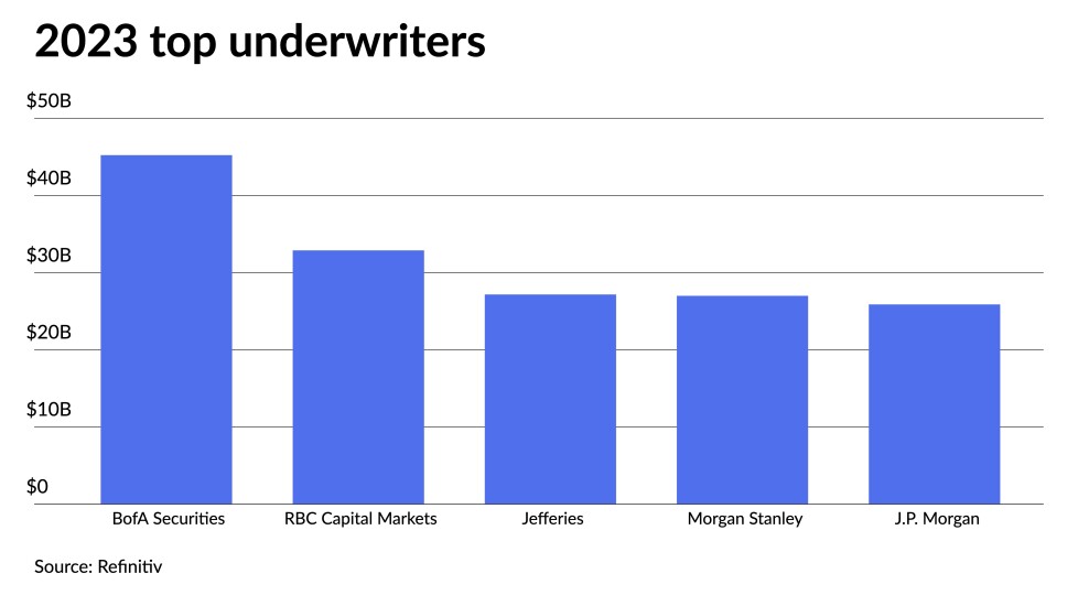 The top underwriters accounted for $362.847 billion in 7,268 issues in 2023, versus the $359.846 billion in 7,906 transactions in 2022.