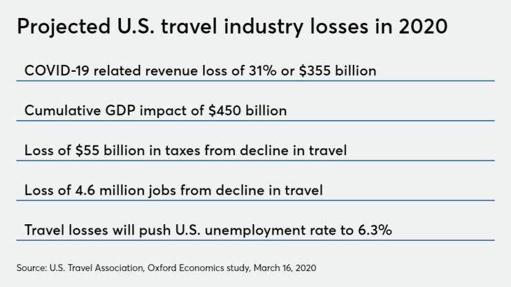 The potential losses, the USTA said, could be more than six times the impact on the travel industry after the Sept. 11, 2001 terrorist attacks, and could be severe enough to push the U.S. into a protracted recession expected to last at least three quarters.