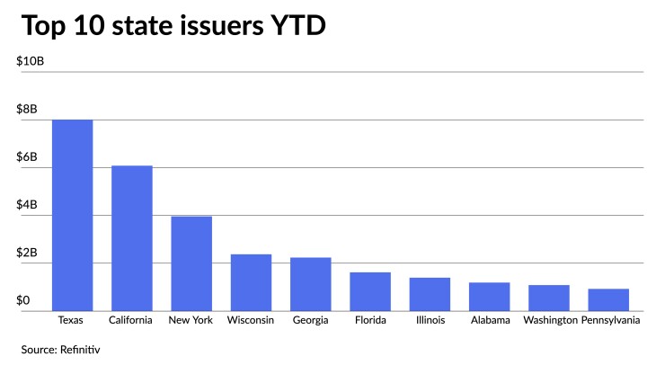 Issuers in the Lone Star State accounted for $8.010 billion, up 5.4% year-over-year. California was second with $6.080 billion, up 15.4%. New York was third with $3.963 billion, down 6.9%, followed by Wisconsin in fourth with $2.377 billion, up 119.6%, and Georgia in fifth with $2.239 billion, a 21.1% increase from 2021.