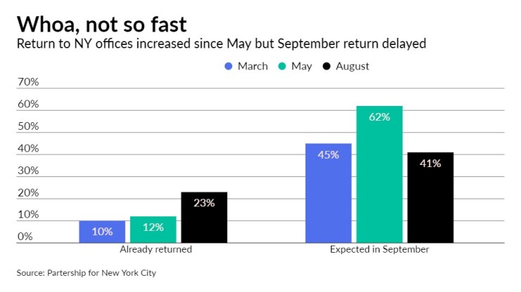 According to the survey, 23% of Manhattan office workers have returned to the workplace. Employers expect that 41% will return by Sept. 30, still way below estimates from the 62% from the partnership’s survey in late May.