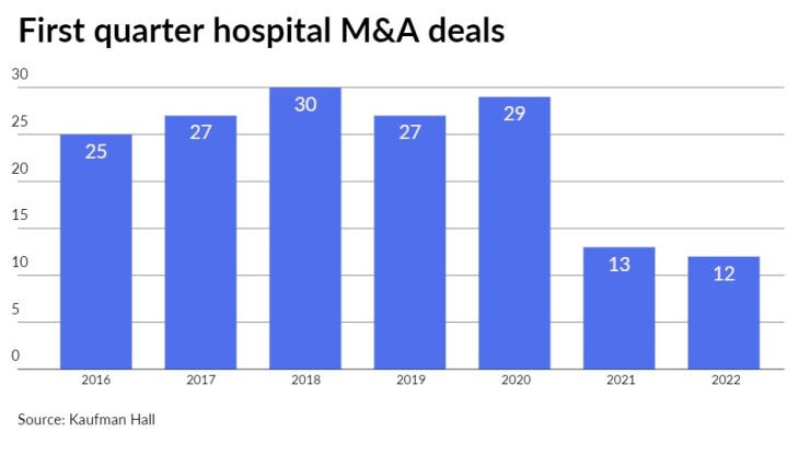 “The lack of Q1 transactions is consistent with the low level of activity its experts have observed throughout the pandemic,” Kaufman Hall said in the report. “The pandemic has affirmed the imperatives of scale and we expect that this quarter’s results will prove to be an anomaly as we (hopefully) move beyond the COVID-related distractions that health systems have faced over the past two years.”
