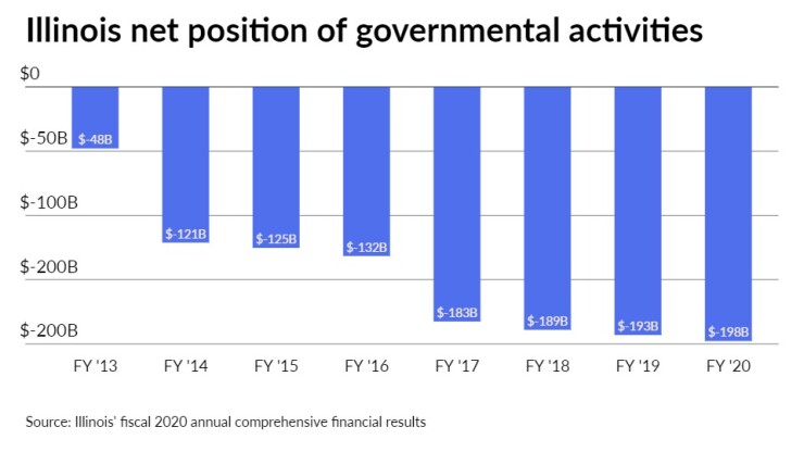 Buoyed by federal COVID-19 pandemic aid, Illinois’ cash position improved in fiscal 2020 while pensions and other obligations pushed the state’s net position of governmental activities deeper in the hole.