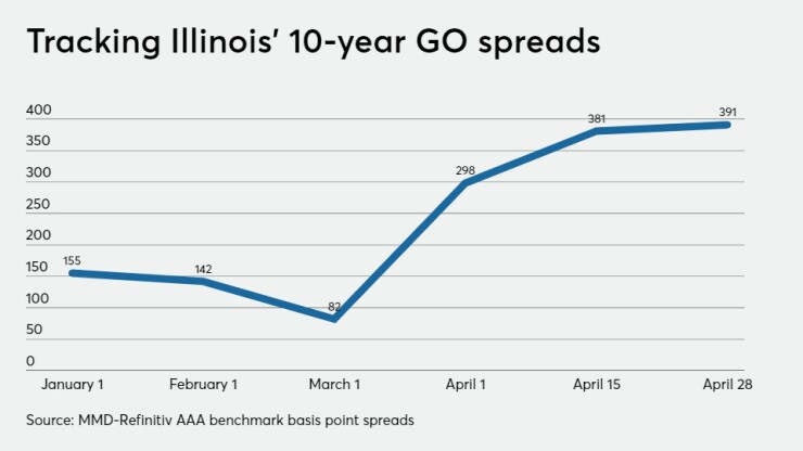 The state is heading into the market with headwinds from both its rating hits and comments from Senate Majority Leader Mitch McConnell that bankruptcy should be an option for states, like Illinois, grappling with big pension burdens. President Trump has offered mixed messages on further relief for cities and states. The Coronavirus Aid, Relief, and Economic Security package, signed March 27, provides funds to states to cover costs related to the coronavirus, but not tax revenue losses.