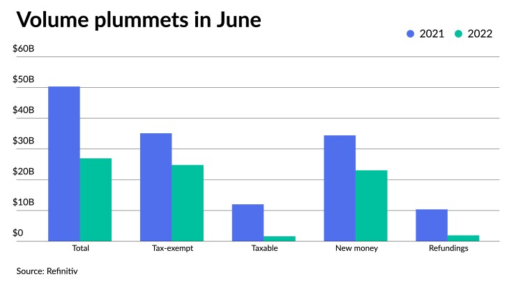 June municipal bond issuance plummeted 46% year-over-year, led by a steep drop in taxable and refunding volumes as issuers sat on the sidelines amid the Federal Reserve's 75 basis-point rate hike.