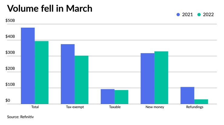 Municipal issuance fell 17.6% year-over-year in March led in part by a drop in refunding volumes amid continuing market volatility and a rising-rate environment, but the total $39.4 billion figure is above the $34.363 billion 10-year average.