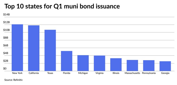 Issuance of revenue bonds decreased 24.7% to $21.910 billion from $29.094 billion in March 2021, and general obligation bond sales dropped 6.5% to $17.452 billion from $18.669 billion in 2021.