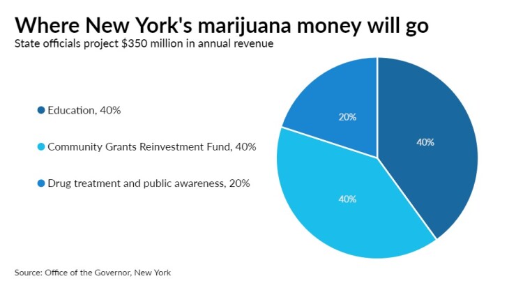 Under the pot bill, 40% of the revenue will go to the State Lottery Fund for public education, 40% for so-called equity programs in communities harmed by prior drug laws and 20% for drug treatment and prevention programs. It creates an office of cannabis management to implement the program, with half the licenses dedicated to equity applicants.