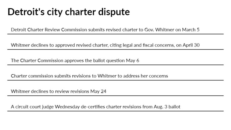 Proposed revisions to Detroit’s charter can’t appear on the August ballot due to Gov. Gretchen Whitmer’s refusal to sign off on the proposed changes, a Wayne County circuit court has ruled.