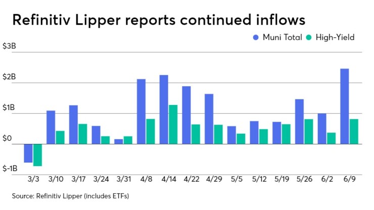 For the 14th week in a row, investors felt bullish about municipal bond funds and continued to pour cash into them. Refinitiv Lipper reported $2.5 billion of inflows in the latest reporting period with high-yield muni funds seeing $816 million of inflows.