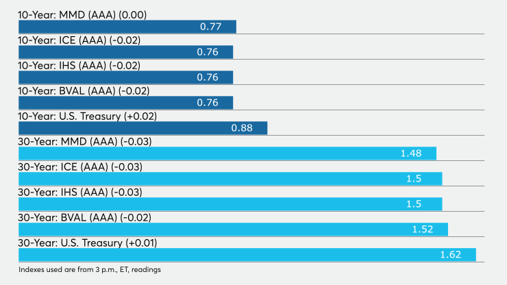 The BVAL AAA curve showed the yield on the 2021 maturity unchanged at 0.15% and 0.16% in 2021 and 2022, while the 10-year dropped two basis points to 0.76% and the 30-year fell two basis points to 1.52%.