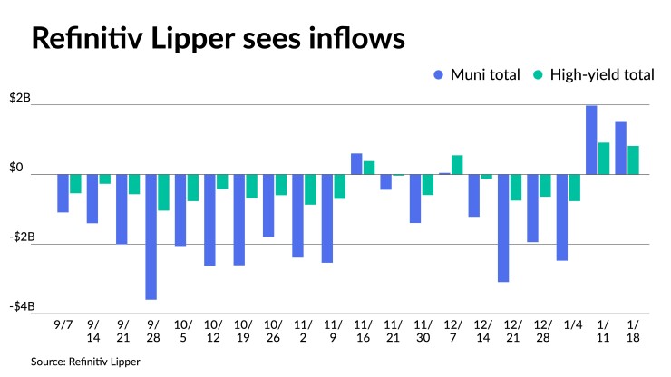 Inflows continued as Refinitiv Lipper reported $1.511 billion was added to municipal bond mutual funds in the week ending Wednesday after $1.981 billion of inflows the week prior.