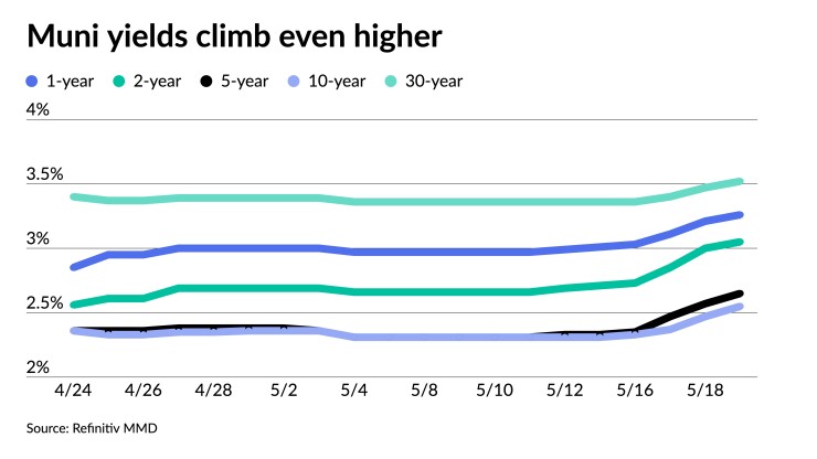 The one-year muni was at 3.26% Friday — the highest it has been in 10 years — and the two-year was at 3.05%, according to Refinitiv MMD. The five-year was at 2.65% and the 10-year at 2.55% Friday.