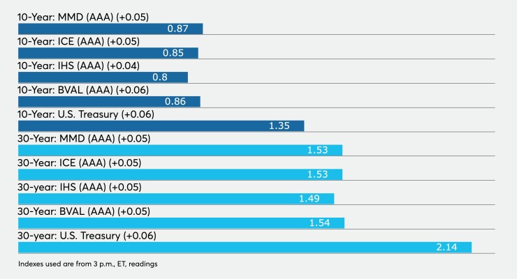 The IHS Markit municipal analytics AAA curve showed yields at 0.10% in 2022 and at 0.11% in 2023 while the 10-year rose four basis points to 0.80% and to 30-year rose five to 1.49%.