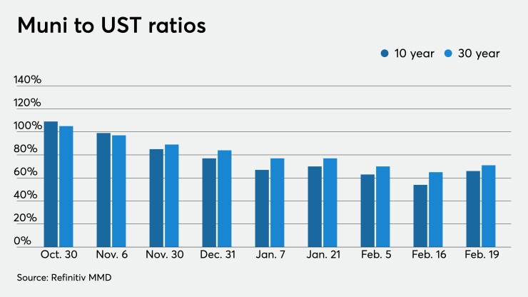 Municipal to U.S. Treasuries — while still historically low — rose again, two basis points to 66% in 10 years (12 basis points higher than Tuesday) and steady at 71% in 30 years (six basis points higher), according to Refinitiv MMD. ICE Data Services showed ratios rose two basis points to 64% in 10 years and steady 72% in 30. BVAL showed 10-year ratios rose three basis points to 62% and were two basis points higher at 74% in 30 years.