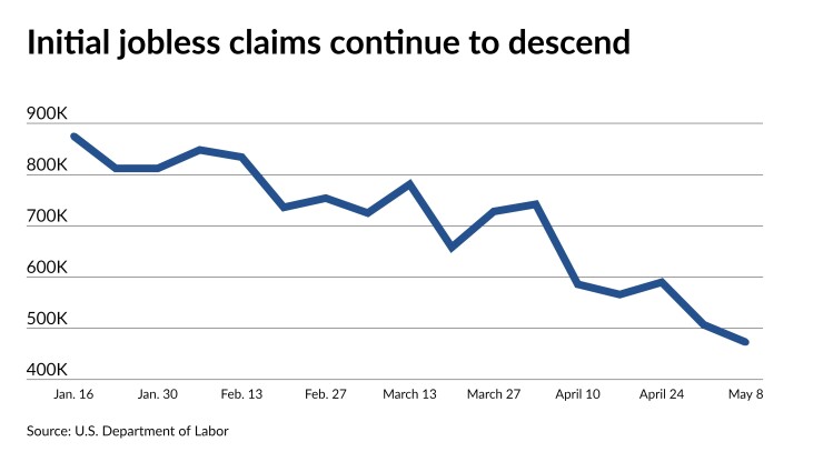 Separately, Initial jobless claims fell to a new pandemic low of 473,000 on a seasonally adjusted annual basis in the week ended May 8 from an upwardly revised 507,000 a week earlier, first reported as 498,000.