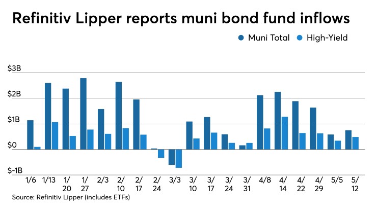 Refinitiv Lipper reported $750 million of inflows into municipal bond mutual funds for the week ending May 12 while high-yield funds saw $487 million of inflows. This follows $584.1 million and $341.4 million, respectively, the week prior.