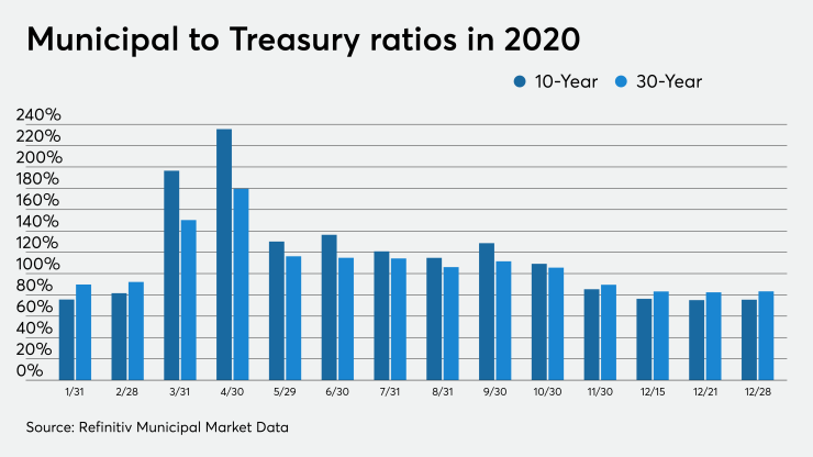 Yields on top-rated munis were flat Monday across AAA scales. Muni to U.S. Treasury ratios stood at 75.5% in 10-years and 83.3% in 30-years, according to Refinitiv MMD, and 74% in 10-years and 85% in 30-years, according to ICE Data Services. Ratios on the 10-year bonds have been below 80% for the month of December.