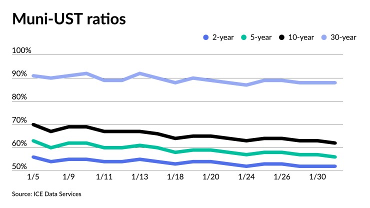 The three-year muni-UST ratio was at 54%, the five-year at 57%, the 10-year at 62% and the 30-year at 88%, according to Refinitiv MMD's 3 p.m. ET read. ICE Data Services had the three at 53%, the five at 56%, the 10 at 62% and the 30 at 88% at 4 p.m.