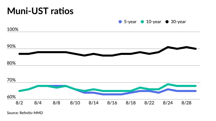 The two-year muni-to-Treasury ratio Tuesday was at 65%, the three-year at 66%, the five-year at 68%, the 10-year at 72% and the 30-year at 92%, according to Refinitiv MMD's 3 p.m. read. ICE Data Services had the two-year at 64%, the three-year at 65%, the five-year at 65%, the 10-year at 68% and the 30-year at 90% at 4 p.m.