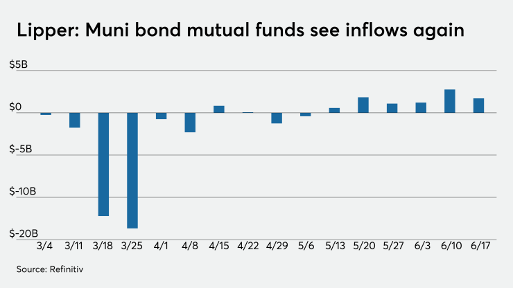 In the week ended June 17, weekly reporting tax-exempt mutual funds saw $1.710 billion of inflows, after inflows of $2.759 billion in the previous week, according to data released by Refinitiv Lipper Thursday.