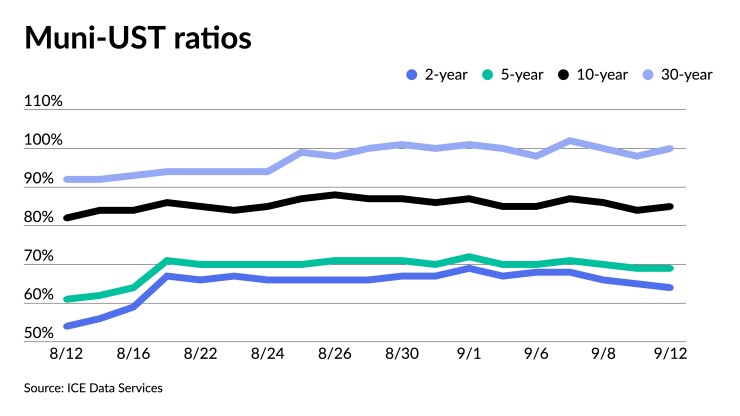 Two- and three-year muni-UST ratios are around 64% to 65%. The five-year was at 69%, the 10-year at 81% and the 30-year at 100%, according to Refinitiv MMD's 3 p.m. read. ICE Data Services had the five at 69%, the 10 at 85% and the 30 at 100% at a 4 p.m. read.