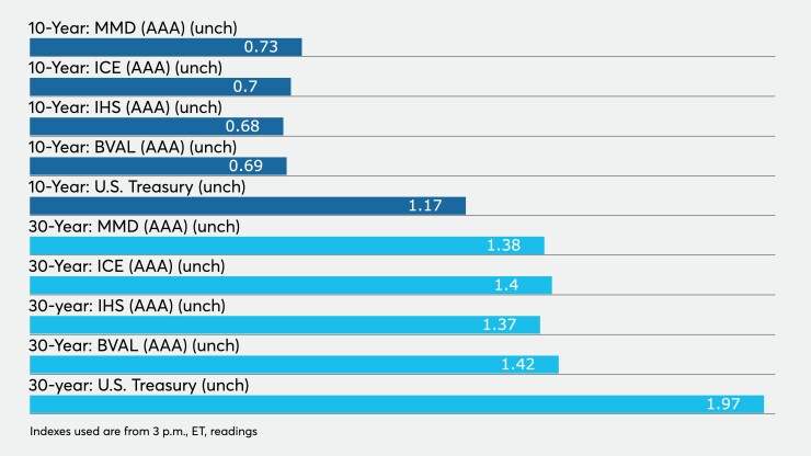 The IHS Markit municipal analytics AAA curve showed yields at 0.09% in 2022 and 0.10% in 2023 while the 10-year remained at 0.68% and the 30-year at 1.37%.