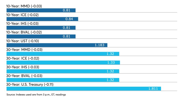 The IHS Markit municipal analytics curve showed short yields at 0.07% and 0.10% in 2022 and 2023, respectively, with the 10-year falling three to 0.81%, and the 30-year yield also down three to 1.32%.
