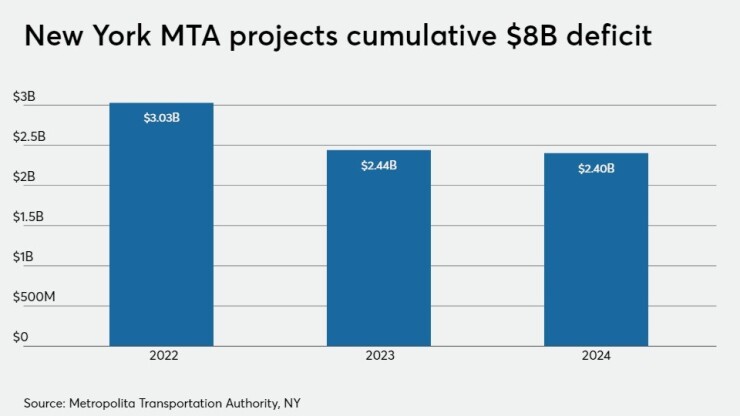 The state-run MTA, one of the largest municipal issuers with $48.3 billion of debt including special credits, operates New York City’s subways, buses, two commuter rail lines and several interborough bridges and tunnels.