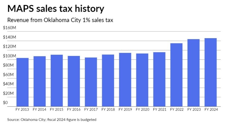The city is projecting "reasonable and conservative" growth in the one-cent sales tax, according to Bryant. The MAPS 4 tax is forecast to raise $145.77 million in fiscal 2024, up 1.45% from fiscal 2023.