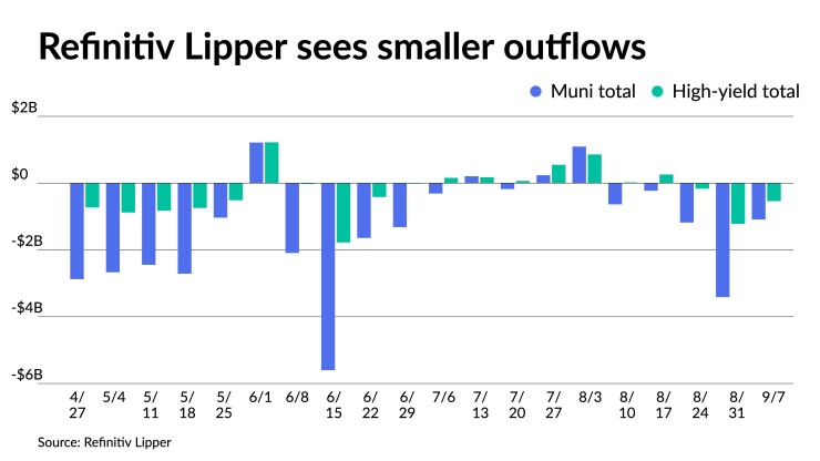 National funds had outflows of $1.040 billion after outflows of $2.957 billion the previous week while high-yield muni funds reported outflows of $539.623 million after outflows of $1.218 billion the week prior.
