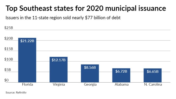 Municipal bond issuers in the Southeast sold $76.91 billion of bonds in 1,152 issues in 2020, putting volume slightly ahead of 2019, according to Refinitiv data.