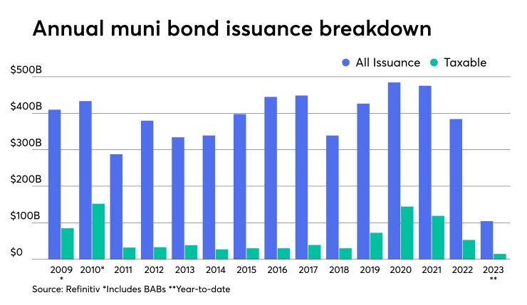 And while "new-issue supply of taxable municipals will remain suppressed" for the year, Dan Close, head of municipals at Nuveen, said, as 2023 "progresses and interest rates become more range-bound and potentially decline, we could see an uptick in issuance."