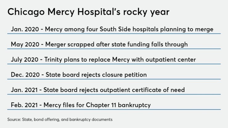 Mercy Hospital and Medical Center and Mercy Health System, which became part of the national system nearly a decade ago operating as a “health ministry” under the system, filed for bankruptcy after its efforts to wind down operations were stymied by a state board that has a say on hospital openings, expansions, and closures.