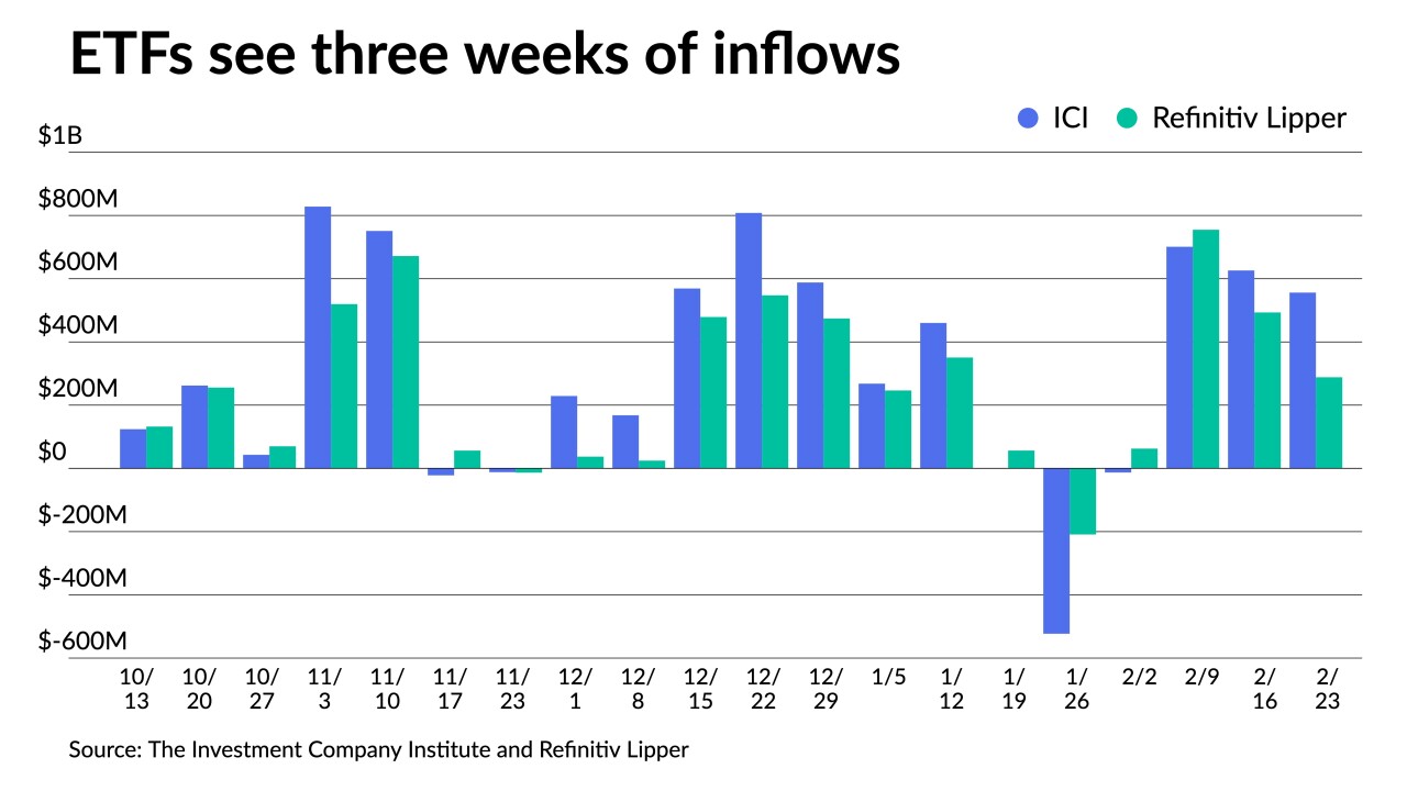 ETFs pulled in just more than $2 billion in February while muni mutual funds saw $8.5 billion of outflows.