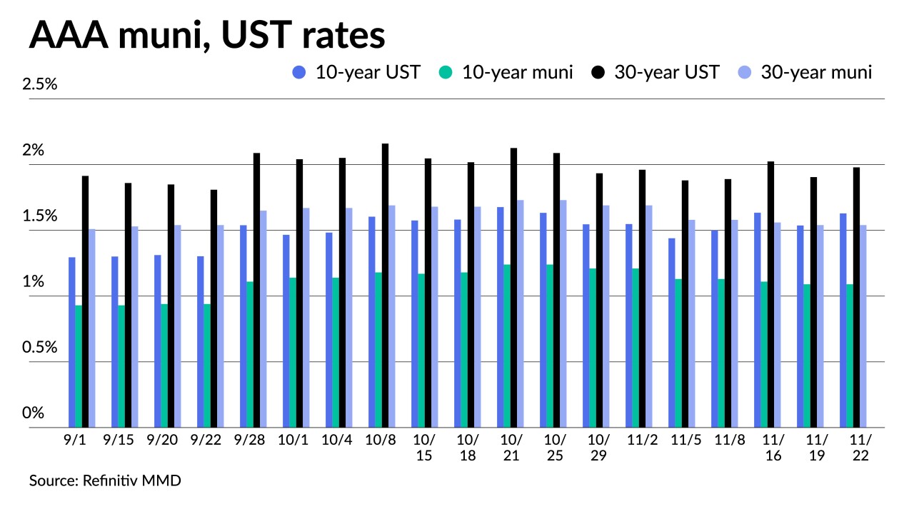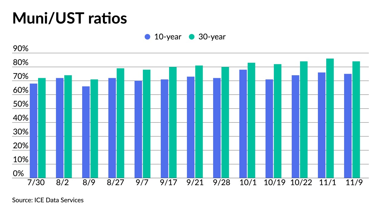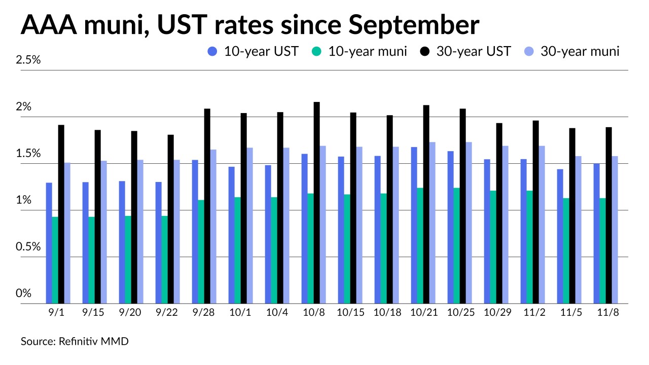 Municipals were quiet on Monday following Friday's rally and ahead of the $9.6 billion estimated to be priced early in the week before the Veterans Day holiday close Thursday. Connecticut priced for retail.