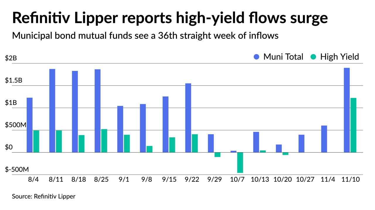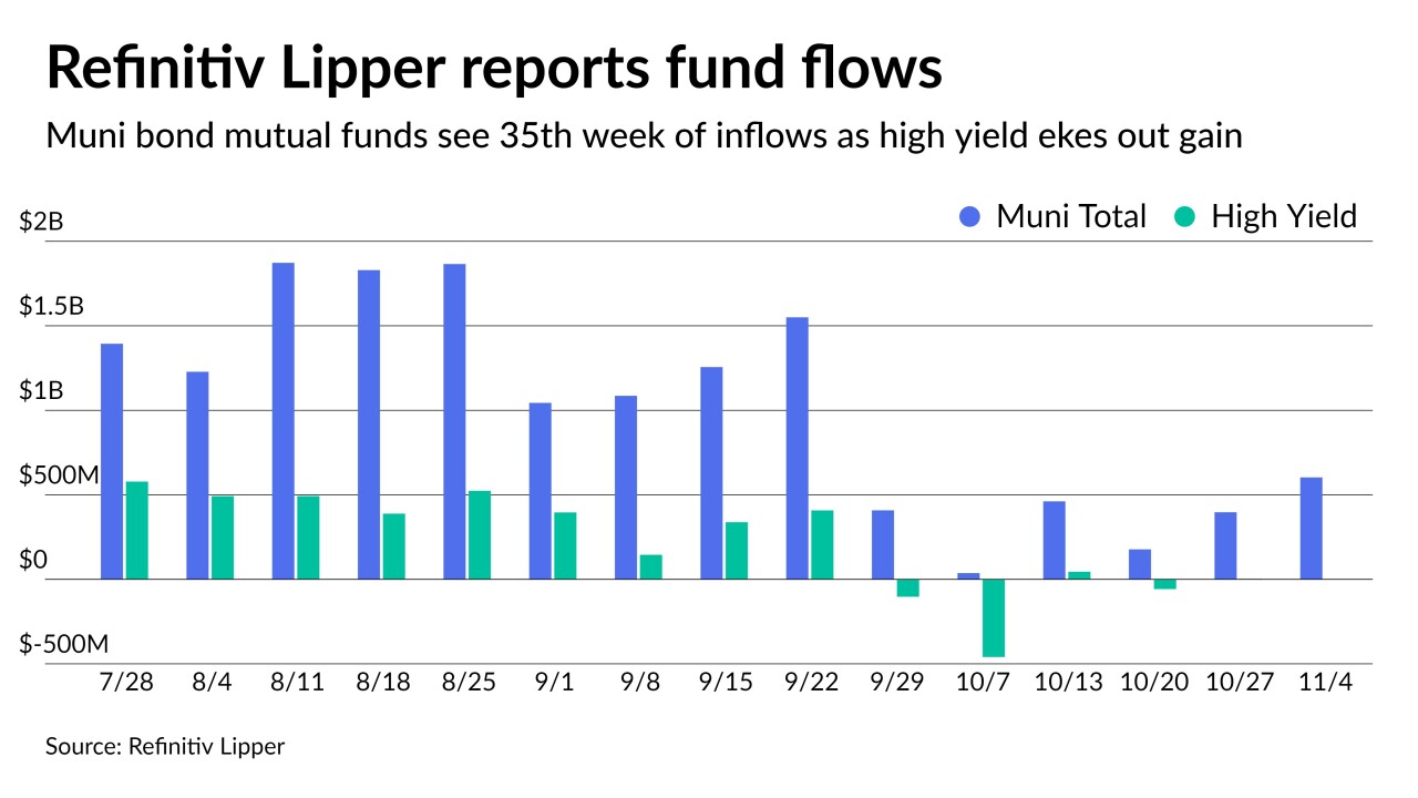For 35 weeks in a row, investors have put cash into municipal bond funds as Refinitiv Lipper reported $603 million of inflows while high-yield funds eked out a gain of slightly more than $1 million.