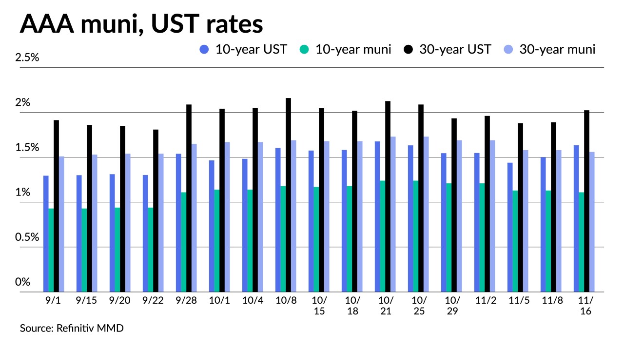 Triple-A benchmarks have fallen double digits since Nov. 1, with the largest moves out long. California, the District of Columbia, Wisconsin and other issuers part of a $6 billion new-issue calendar priced.