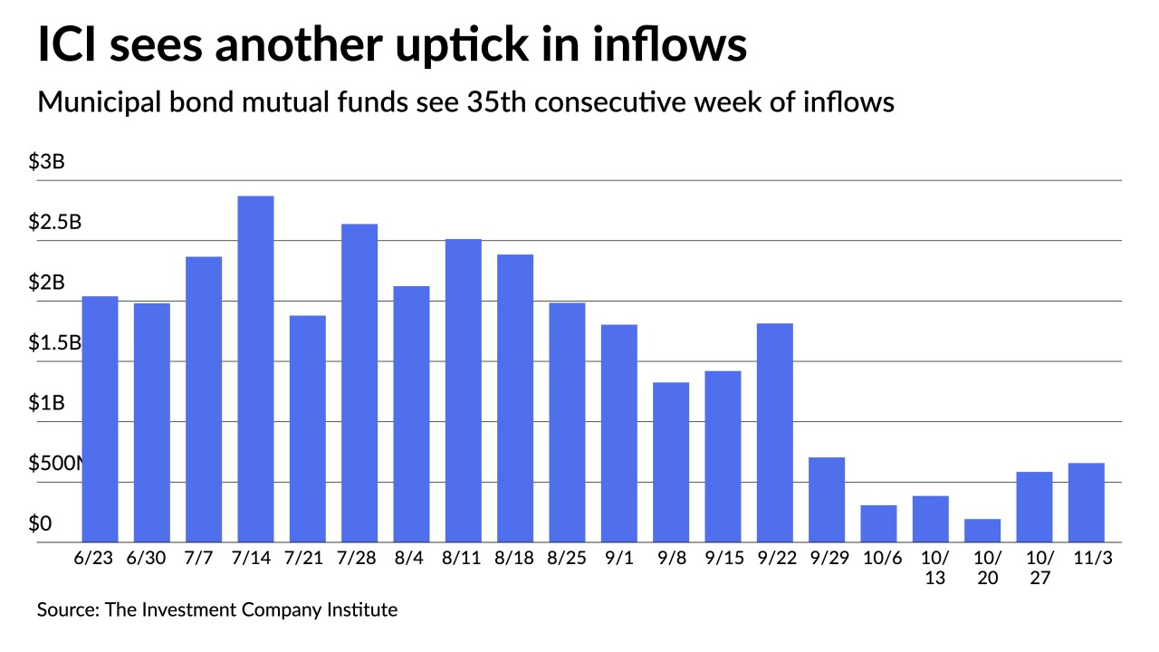 The Investment Company Institute reported $657 million of inflows into municipal bond mutual funds while ETFs saw $828 million of inflows, a massive increase over the $43 million reported a week prior.