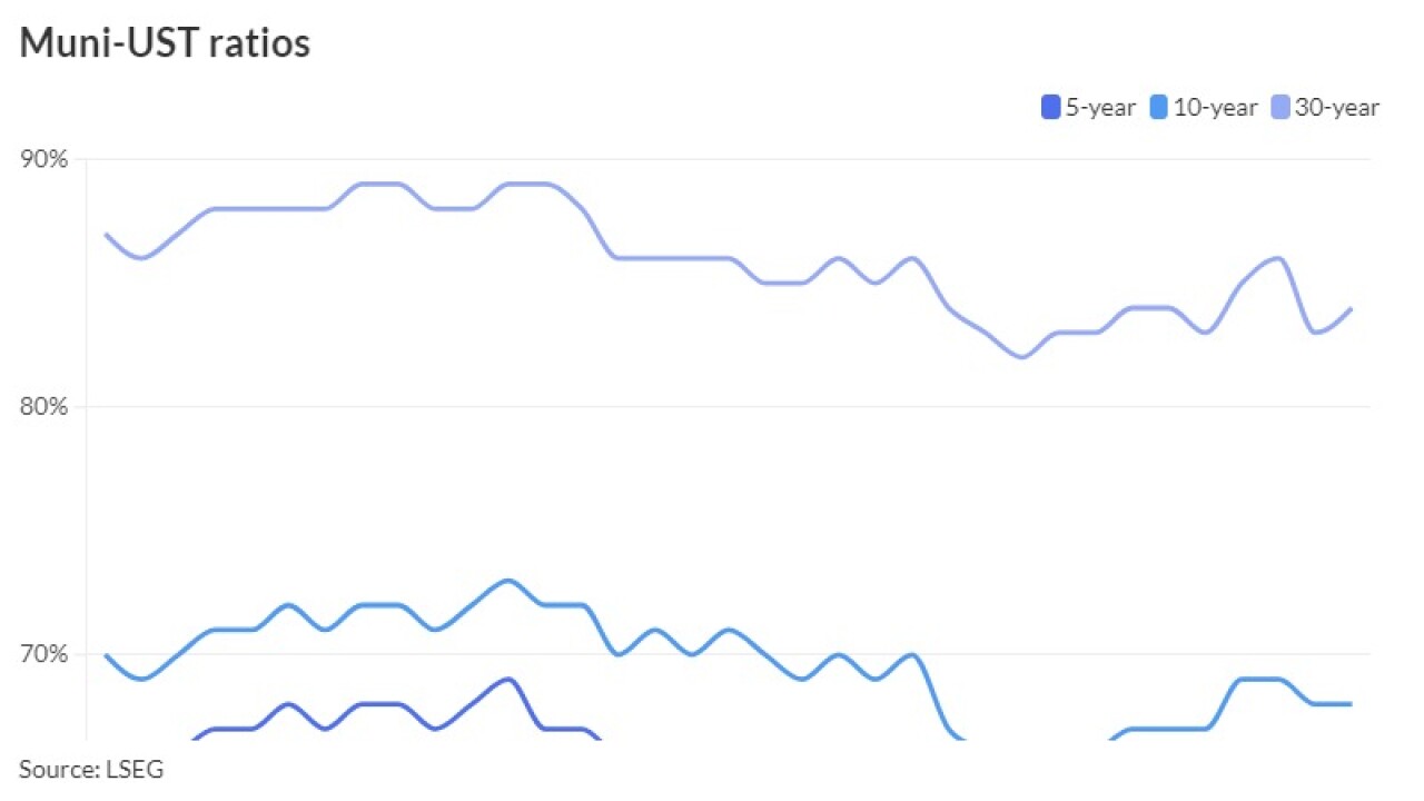 The correction to the municipal market has improved muni to UST ratios while uncertainty hangs over ahead of the election. J.P. Morgan's Peter DeGroot said the firm expects the end of next week "will mark the end of the difficult technical period in 2024 and believe that net supply in November will lead to better valuations broadly in the municipal market."