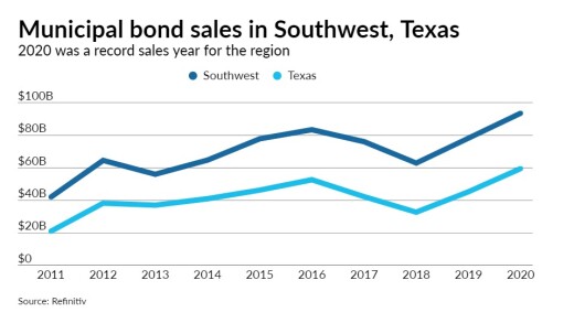 Municipal issuers in the Southwest sold $93.5 billion of debt in 2020, a year in which the coronavirus upended the way bond business is done.