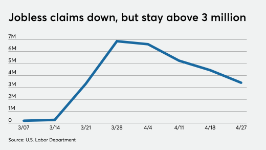 Thursday’s jobless claims at 3.839 million, weaker income and spending data show COVID-19 continues to dampen economic activity.