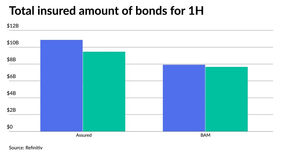 The two most active bond insurers — Assured Guaranty and Build America Mutual — accounted for $17.132 billion of deals in the first two quarters compared to $18.794 deals over the same period in 2021.