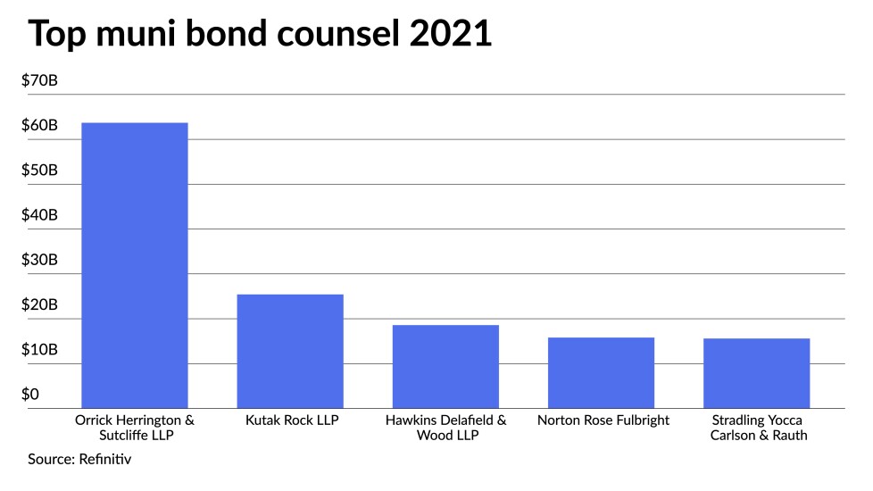 The top bond counsel firms combined for a total of $454.93 billion in 11,753 transactions during 2021, up from the $450.35 billion in 11,751 deals over the same period in 2020.