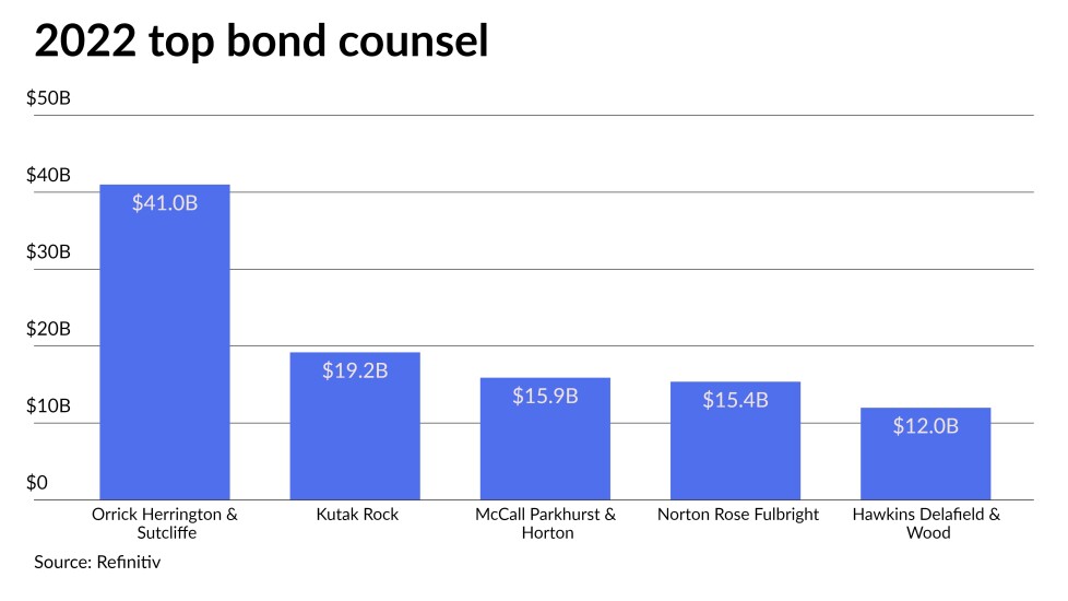 The top bond counsel firms combined for a total of $359.123 billion in 7,878 transactions during 2022, down from the $456.136 billion in 11,819 deals in 2021.