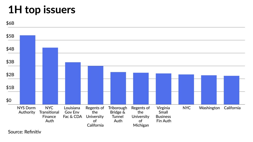Five new issuers entered the top 10, two of which did not sell debt in the first half of 2021. The five issuers who fell out of the top 10 — the state of Connecticut, the New York City Housing Development Corporation, the Port Authority of New York and New Jersey, the California Statewide Communities Development Authority Community Improvement Authority and the New Jersey Transportation Trust Fund Authority — are no longer among the top 20 issuers.