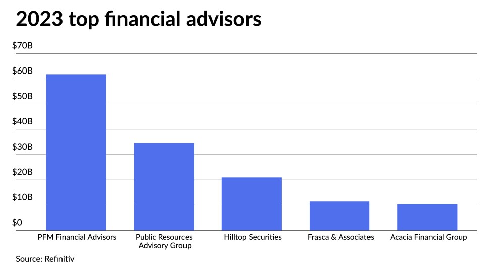 Of the $312.508 billion of par issued, municipal financial advisors saw $312.178 billion of business in 5,531 transactions in 2023. This compares to the $305.035 billion in 5,934 deals in 2022, out of a total of $305.149 billion.