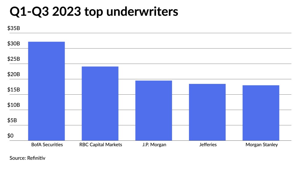 The top municipal underwriters accounted for $265.047 billion in 5,383 issues in the first three quarters of 2023, down from $291.908 billion in 6,417 transactions over the same time period in 2022.
