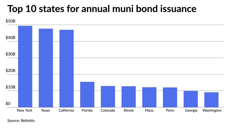 Issuers in the Empire State sold $49.385 billion, a 2.3% increase year-over-year. Texas was second with $47.666 billion, down 9.5% year-over-year, California was third with $46.984 billion, down 45.8%. Florida came in fourth with $15.453 billion, down 15.9%, and Colorado rounds out the top five with $12.925 billion, a 2.1% decrease from 2021.