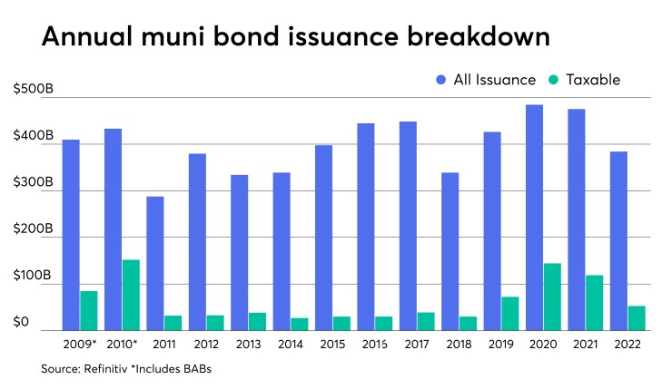 The muni market saw $384.086 billion of debt issued in 2022, nearly $100 billion less than 2021's $483.234 billion.