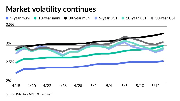 Refinitiv MMD’s scale was cut two to five points at the 3 p.m. read: the one-year at 1.99% (+2) and 2.31% (+2) in two years. The five-year at 2.58% (+2), the 10-year at 2.99% (+5) and the 30-year at 3.32% (+5).